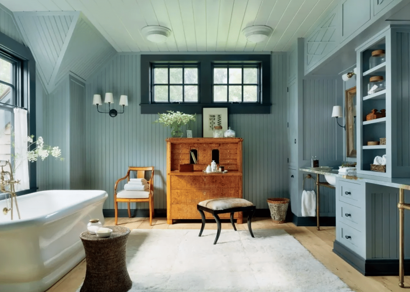 “Ceiling’s don’t always have to be white! When you don’t want the contrast between the walls with either a low basement ceiling or with high irregular shaped ceilings, I encourage my clients to take their wall color all the way up and over.”