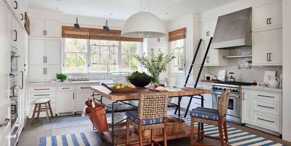 A few industrial touches goes a long way to update the traditional look of farmhouse design, making it more modern. Here, vintage kilim rugs and rustic wood accents get a modern twist with an industrial ladder and cabinet hardware.