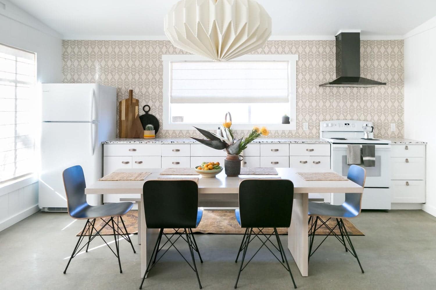 These metal cabinets are original to the cabin and the owner loved them. To update, she added leather pulls (love!) and a patterned tile backsplash that goes all the way to the ceiling. The new pendant light replaced the ceiling light. How gorg is this?