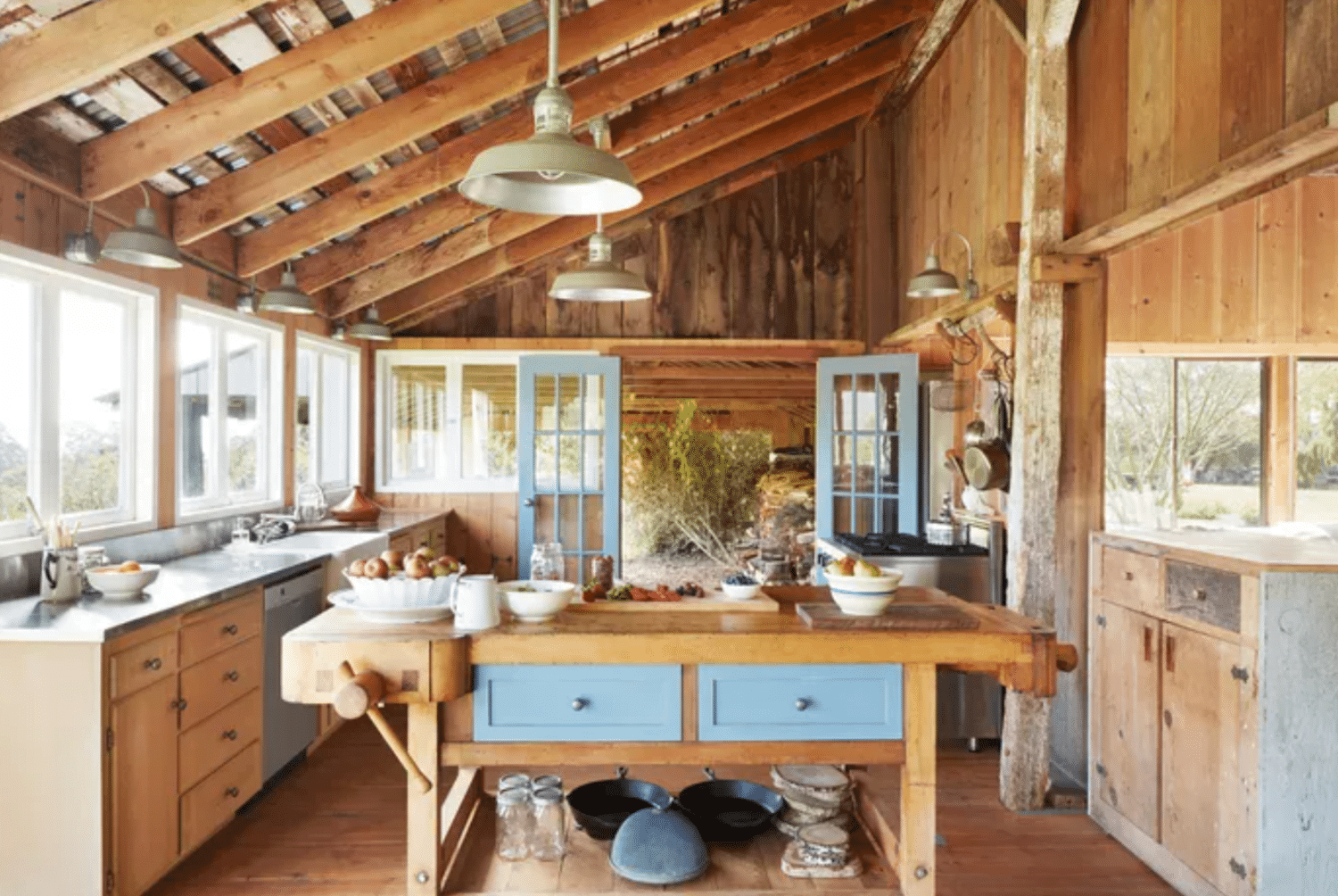 A couple of swipes of sky-blue paint. That’s all it took to modernize this super cute cabin kitchen without losing the integrity of the natural decor. Paint the door and a few drawers and poof! Easy, impactful cabin transformation.