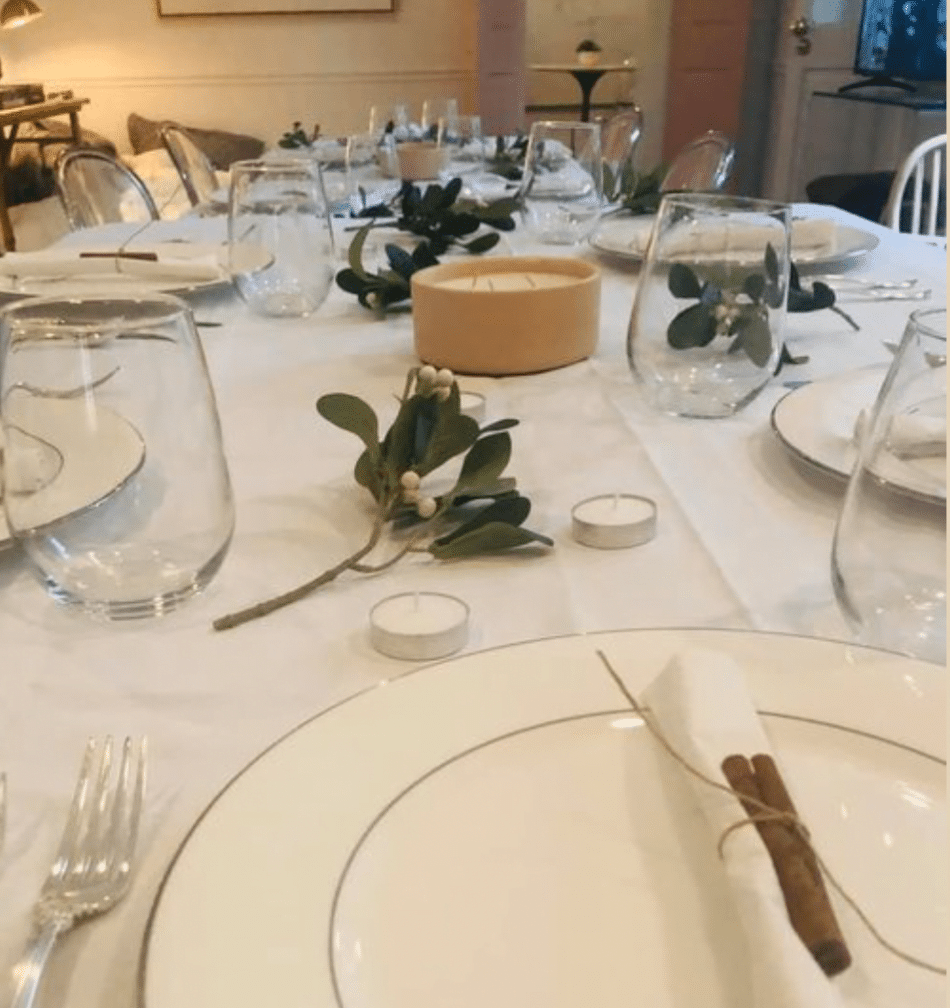 “Because we celebrate Hanukkah instead of Christmas our decorations during the holidays are not as extensive. But, I love setting a holiday table. I always bring in evergreen branches and hang the holiday cards that we receive. “—Angela