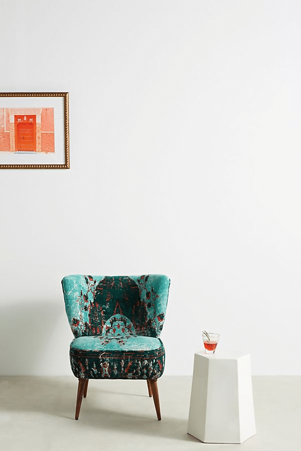 With all the bold colors and prints on the rise, we knew bohemian vibes couldn’t be far behind. At the heart of the trend? A combination of mixed textures such as wood, metal, and natural materials. Take a look at this chair from Anthropologie. Love the bold jewel tone teal, with the wood legs and subtle floral pattern!