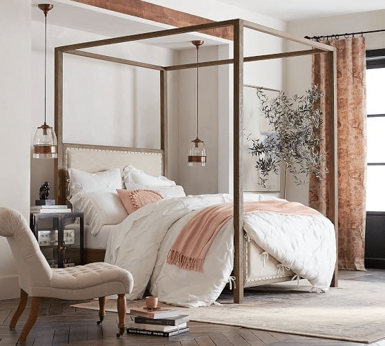 Make a statement with a canopy bed. If you have the room for one, we say, go for it! Canopy beds offer elegance to your bedroom, and it doesn’t hurt that sleeping in one gives you a sense of comfort and security! There’s a canopy for every style from modern to traditional. We love this country chic wooden bed from Pottery Barn.