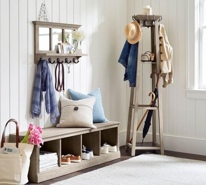 I like to keep it simple. A bench, mirror, and hooks for your coat and keys.