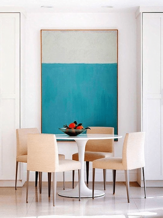 You don’t have to stick with small art when you’re space-challenged. A large piece of art will draw the eyes up making your walls seem bigger and your ceilings seem higher than they are. So yes, go large and in charge.