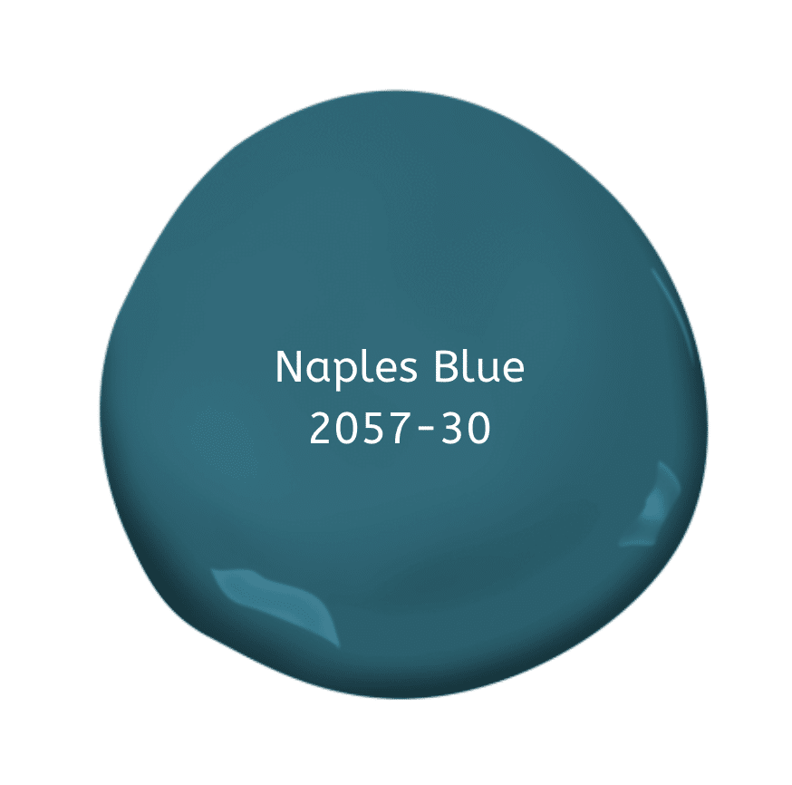 Naples Blue, 2057-30 is a rich, saturated teal that will bring a lot of life and warmth into a room. A  perfect color for an accent wall, family room, or a bold choice for a dining room. Thinking of repainting an old piece of furniture? Angela says bring it to life with Naples Blue!