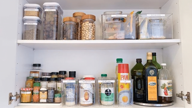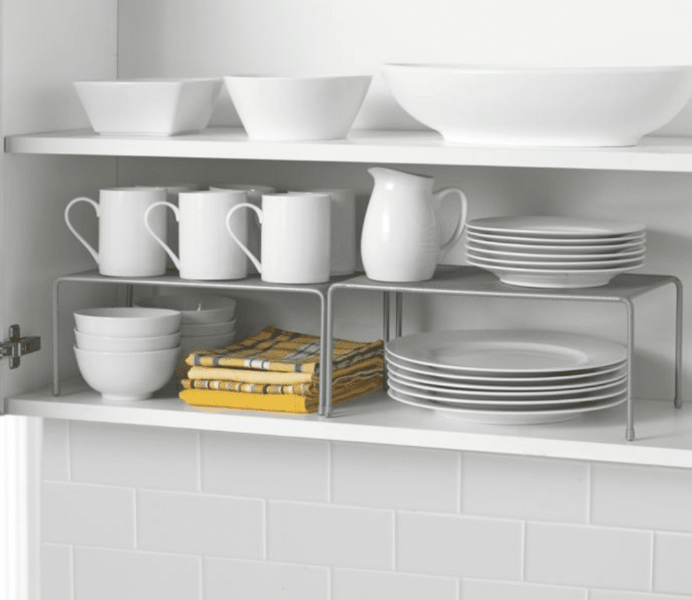 Most kitchen cabinets have very high shelves, and people ending up stacking different types of items to make the most of the space. But it’s super annoying to have to lift up a whole stack of small plates just to reach one large one. A shelf system can help you keep different items separate, so you can just reach for what you need. Plus, they can be super affordable!