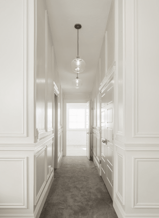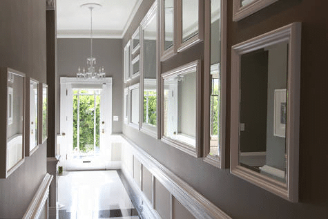 Mirrors are an easy way to make a space feel bigger (or wider). While we wouldn’t suggest framed mirrors in a hallway that didn’t pass the chicken test, you can take advantage of existing wainscoting or paneling to inset the mirrors.