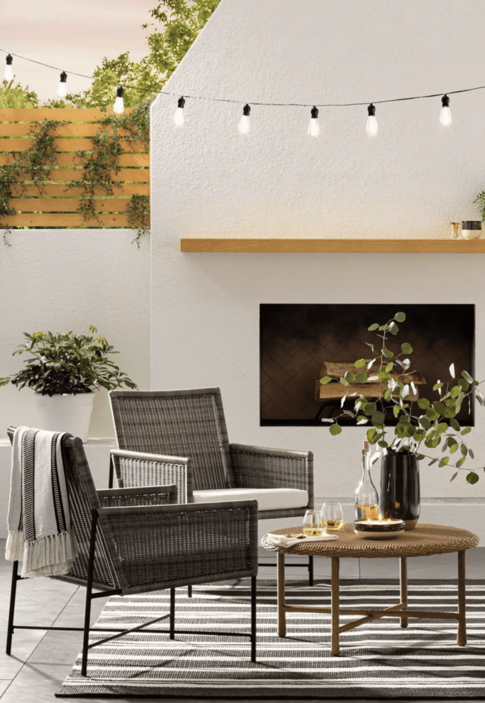 I recommend the 2-pack Wicker & Metal X Frame Patio Chairs from Target. They’re super versatile and the neutral color will go with anything. You can dress them up or down with outdoor accent pillows, accessories, and rugs. They’re sophisticated yet affordable. A win-win in my book.