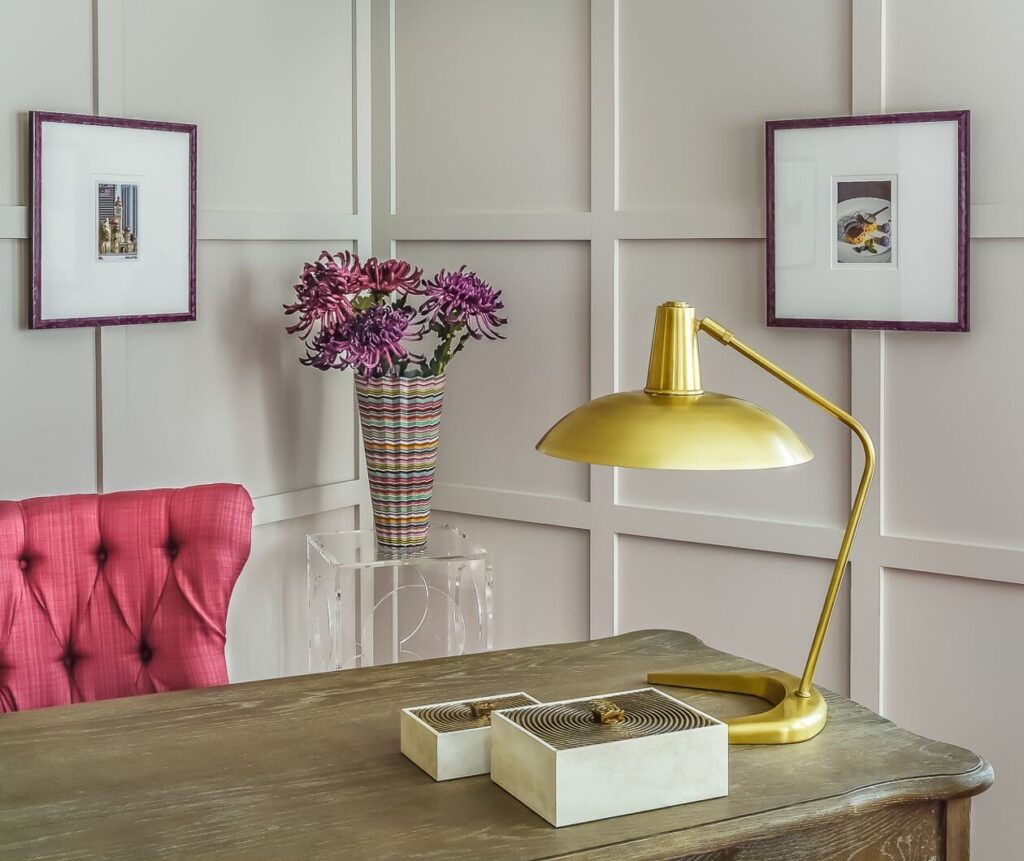 Think about the person or people with whom you’ll be meeting. What can you place behind you to inspire and intrigue? Betsy has a very intentional gallery wall using her fave Benjamin Moore blue paint topped with bright white RIVA frames from IKEA. She knows this presentation excites her clients and helps them trust her design sensibility.