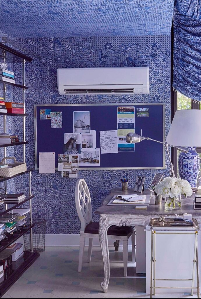 Think about the person or people with whom you’ll be meeting. What can you place behind you to inspire and intrigue? Betsy has a very intentional gallery wall using her fave Benjamin Moore blue paint topped with bright white RIVA frames from IKEA. She knows this presentation excites her clients and helps them trust her design sensibility.